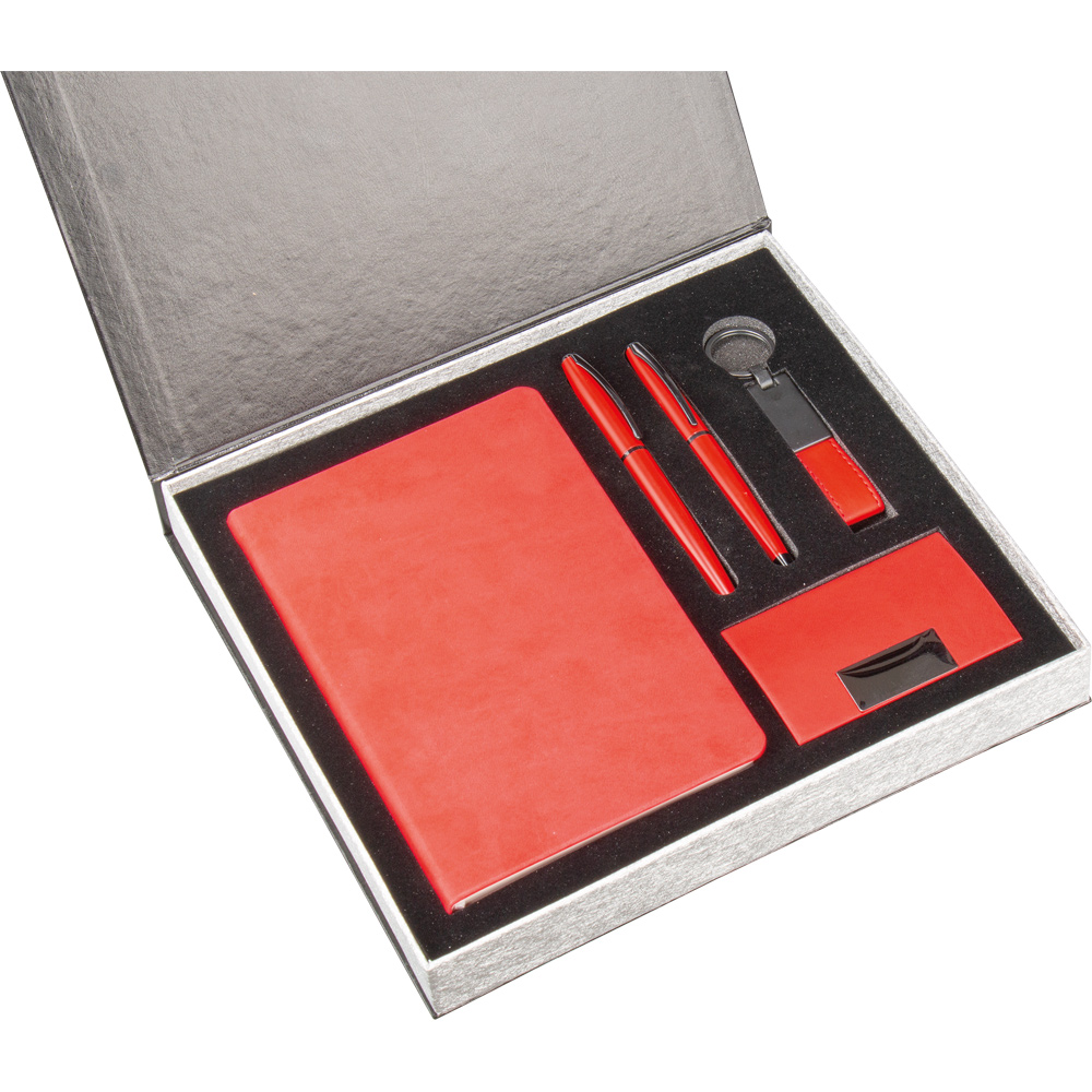 * Metal Kalem Roller (0555-490) * Termo Deri Defter 9,5 x 14 cm (İstiklal) * Deri Cüzdan Kartlık * Metal ve Deri Anahtarlık (AN-6230) * Kutu: Cilt Bezi