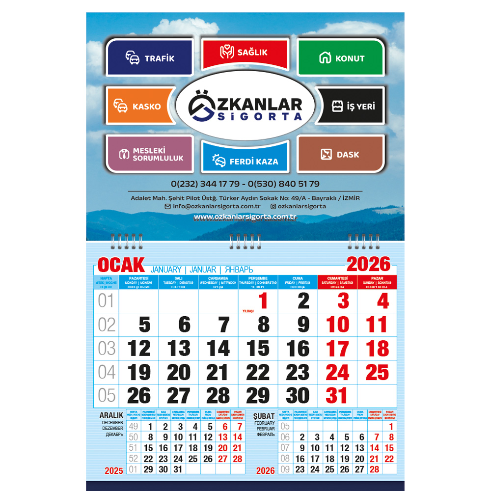 * Tek Parça Spiralli * Takvim Ebat: 31 x 63 cm * Ayna: 350gr. A.Bristol * Alt Karton: 350gr. A.Bristol * Reklam Alanı: 31 x 21,5 cm * Blok Ebat: 31 x 43 cm * Yaprak Kağıdı: 80gr. 1.Hamur * 6 Yaprak