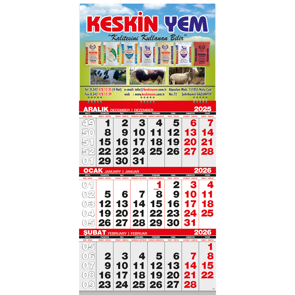 * Tek Parça Spiralli * Takvim Ebat: 32 x 48 cm * Ayna: 350gr. A.Bristol * Alt Karton: 350gr. A.Bristol * Reklam Alanı: 32 x 23 cm * Blok Ebat: 32 x 25 cm * Yaprak Kağıdı: 80gr. 1.Hamur * 12 Yaprak
