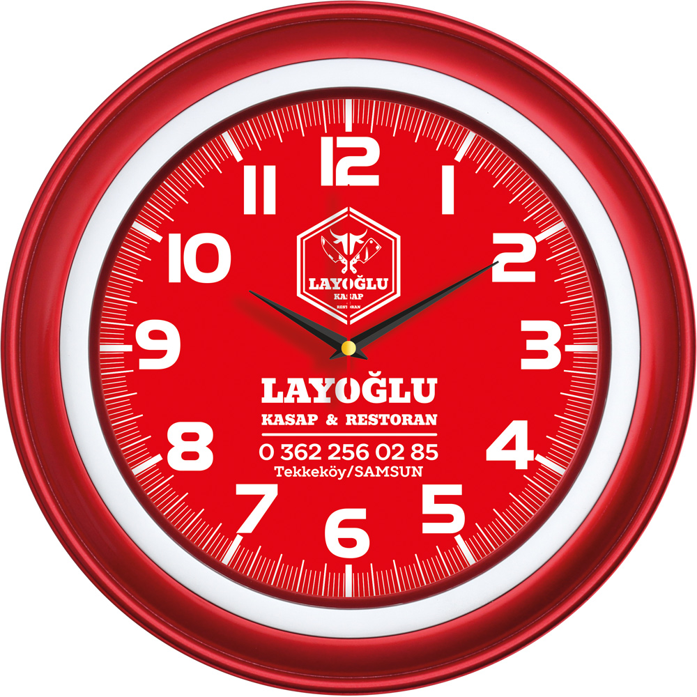 * Ebat: 35 cm * Çerçeve: Plastik * Kadran: Bristol * Saniye: Akar * Cam: Mineral * Baskı: Ofset, Dijital * Koli Adeti: 20
